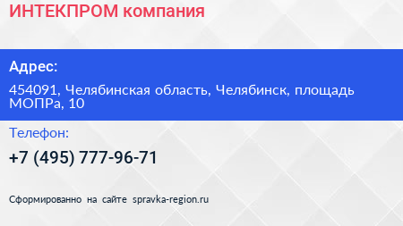 ИНТЕКПРОМ, компания по адресу 454091, Челябинская область, Челябинск, площадь МОПРа, 10 в дальнейшем Организация, размещена в следующих категориях: