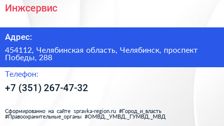 Инжсервис по адресу 454112, Челябинская область, Челябинск, проспект Победы, 288 в дальнейшем Организация, размещена в следующих категориях: