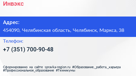 Инвэкс по адресу 454090, Челябинская область, Челябинск, Маркса, 38 в дальнейшем Организация, размещена в следующих категориях: