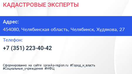 КАДАСТРОВЫЕ ЭКСПЕРТЫ по адресу 454080, Челябинская область, Челябинск, Худякова, 27 в дальнейшем Организация, размещена в следующих категориях: