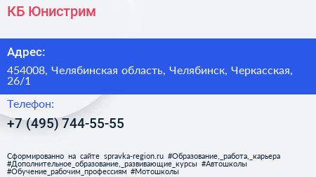 КБ Юнистрим по адресу 454008, Челябинская область, Челябинск, Черкасская, 26/1 в дальнейшем Организация, размещена в следующих категориях: