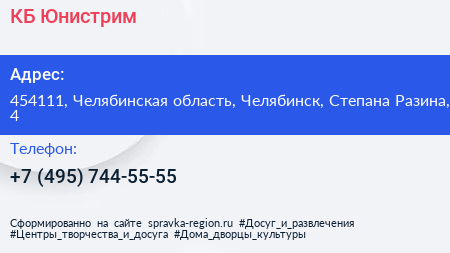 КБ Юнистрим по адресу 454111, Челябинская область, Челябинск, Степана Разина, 4 в дальнейшем Организация, размещена в следующих категориях: