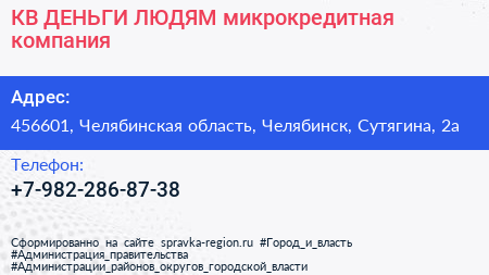 КВ ДЕНЬГИ ЛЮДЯМ, микрокредитная компания по адресу 456601, Челябинская область, Челябинск, Сутягина, 2а в дальнейшем Организация, размещена в следующих категориях: