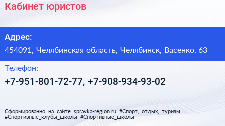 Кабинет юристов по адресу 454091, Челябинская область, Челябинск, Васенко, 63 в дальнейшем Организация, размещена в следующих категориях: