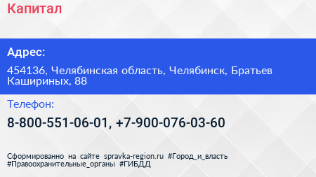 Капитал по адресу 454136, Челябинская область, Челябинск, Братьев Кашириных, 88 в дальнейшем Организация, размещена в следующих категориях: