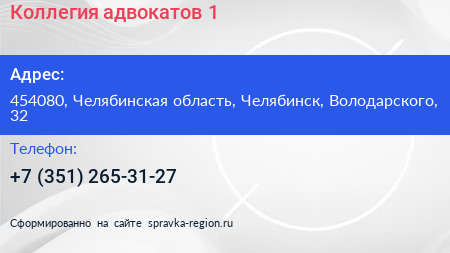 Коллегия адвокатов №1 по адресу 454080, Челябинская область, Челябинск, Володарского, 32 в дальнейшем Организация, размещена в следующих категориях: