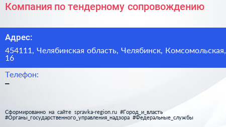 Компания по тендерному сопровождению по адресу 454111, Челябинская область, Челябинск, Комсомольская, 16 в дальнейшем Организация, размещена в следующих категориях: