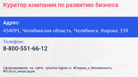 Куратор, компания по развитию бизнеса по адресу 454091, Челябинская область, Челябинск, Кирова, 159 в дальнейшем Организация, размещена в следующих категориях: