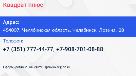 Квадрат плюс по адресу 454007, Челябинская область, Челябинск, Ловина, 28 в дальнейшем Организация, размещена в следующих категориях: