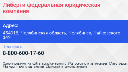 Либерти, федеральная юридическая компания по адресу 454018, Челябинская область, Челябинск, Чайковского, 149 в дальнейшем Организация, размещена в следующих категориях: