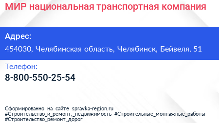 МИР, национальная транспортная компания по адресу 454030, Челябинская область, Челябинск, Бейвеля, 51 в дальнейшем Организация, размещена в следующих категориях: