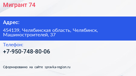 Мигрант 74 по адресу 454139, Челябинская область, Челябинск, Машиностроителей, 37 в дальнейшем Организация, размещена в следующих категориях: