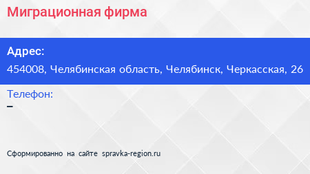 Миграционная фирма по адресу 454008, Челябинская область, Челябинск, Черкасская, 26 в дальнейшем Организация, размещена в следующих категориях: