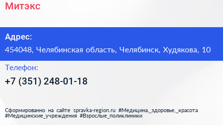Митэкс по адресу 454048, Челябинская область, Челябинск, Худякова, 10 в дальнейшем Организация, размещена в следующих категориях: