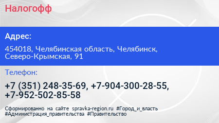 Налогофф по адресу 454018, Челябинская область, Челябинск, Северо-Крымская, 91 в дальнейшем Организация, размещена в следующих категориях: