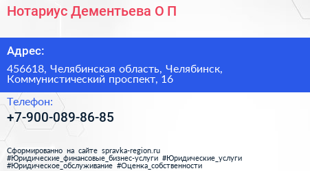 Нотариус Дементьева О.П. по адресу 456618, Челябинская область, Челябинск, Коммунистический проспект, 16 в дальнейшем Организация, размещена в следующих категориях: