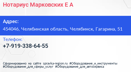 Нотариус Марковских Е.А. по адресу 454046, Челябинская область, Челябинск, Гагарина, 51 в дальнейшем Организация, размещена в следующих категориях: