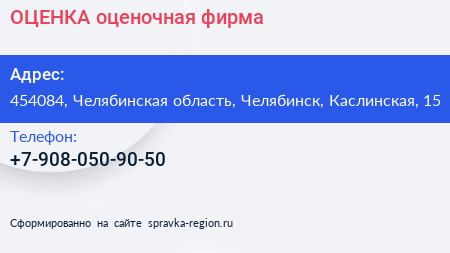 ОЦЕНКА, оценочная фирма по адресу 454084, Челябинская область, Челябинск, Каслинская, 15 в дальнейшем Организация, размещена в следующих категориях:
