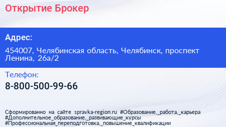 Открытие Брокер по адресу 454007, Челябинская область, Челябинск, проспект Ленина, 26а/2 в дальнейшем Организация, размещена в следующих категориях: