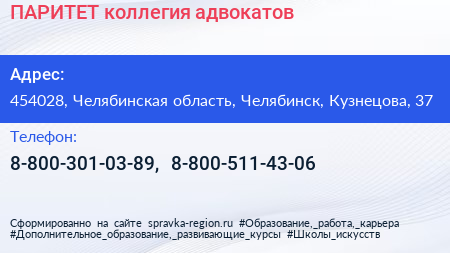 ПАРИТЕТ, коллегия адвокатов по адресу 454028, Челябинская область, Челябинск, Кузнецова, 37 в дальнейшем Организация, размещена в следующих категориях: