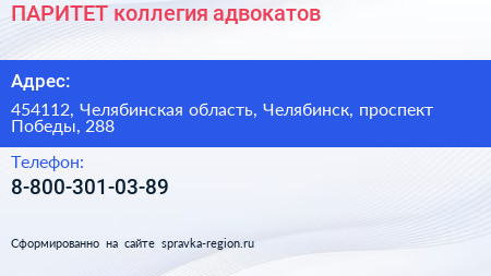 ПАРИТЕТ, коллегия адвокатов по адресу 454112, Челябинская область, Челябинск, проспект Победы, 288 в дальнейшем Организация, размещена в следующих категориях: