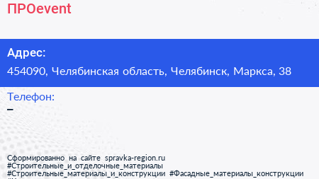 ПРОevent по адресу 454090, Челябинская область, Челябинск, Маркса, 38 в дальнейшем Организация, размещена в следующих категориях:
