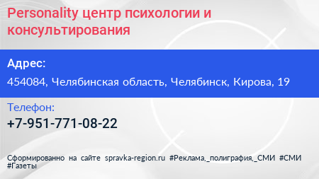 Personality, центр психологии и консультирования по адресу 454084, Челябинская область, Челябинск, Кирова, 19 в дальнейшем Организация, размещена в следующих категориях: