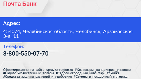 Почта Банк по адресу 454074, Челябинская область, Челябинск, Арзамасская 3-я, 11 в дальнейшем Организация, размещена в следующих категориях: