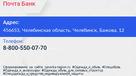 Почта Банк по адресу 456653, Челябинская область, Челябинск, Бажова, 12 в дальнейшем Организация, размещена в следующих категориях: