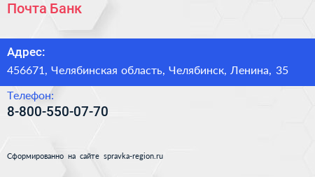 Почта Банк по адресу 456671, Челябинская область, Челябинск, Ленина, 35 в дальнейшем Организация, размещена в следующих категориях: