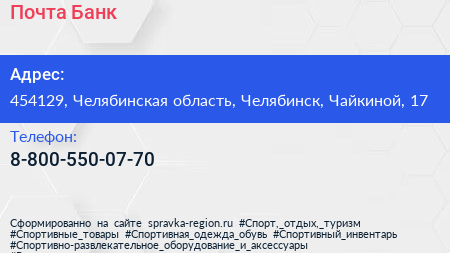 Почта Банк по адресу 454129, Челябинская область, Челябинск, Чайкиной, 17 в дальнейшем Организация, размещена в следующих категориях: