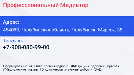Профессиональный Медиатор по адресу 454090, Челябинская область, Челябинск, Маркса, 38 в дальнейшем Организация, размещена в следующих категориях: