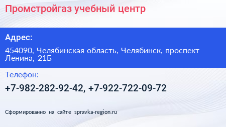 Промстройгаз, учебный центр по адресу 454090, Челябинская область, Челябинск, проспект Ленина, 21Б в дальнейшем Организация, размещена в следующих категориях: