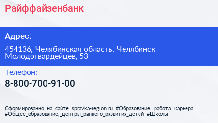 Райффайзенбанк по адресу 454136, Челябинская область, Челябинск, Молодогвардейцев, 53 в дальнейшем Организация, размещена в следующих категориях: