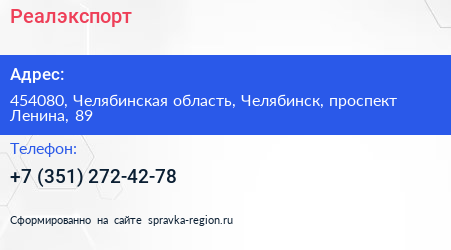 Реалэкспорт по адресу 454080, Челябинская область, Челябинск, проспект Ленина, 89 в дальнейшем Организация, размещена в следующих категориях: