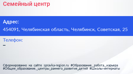 Семейный центр по адресу 454091, Челябинская область, Челябинск, Советская, 25 в дальнейшем Организация, размещена в следующих категориях: