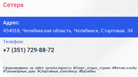 Сетера по адресу 454018, Челябинская область, Челябинск, Стартовая, 34 в дальнейшем Организация, размещена в следующих категориях: