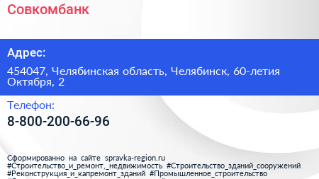 Совкомбанк по адресу 454047, Челябинская область, Челябинск, 60-летия Октября, 2 в дальнейшем Организация, размещена в следующих категориях: