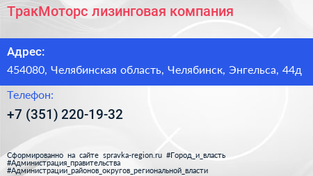 ТракМоторс, лизинговая компания по адресу 454080, Челябинская область, Челябинск, Энгельса, 44д в дальнейшем Организация, размещена в следующих категориях: