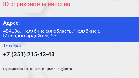 Ю, страховое агентство по адресу 454136, Челябинская область, Челябинск, Молодогвардейцев, 56 в дальнейшем Организация, размещена в следующих категориях: