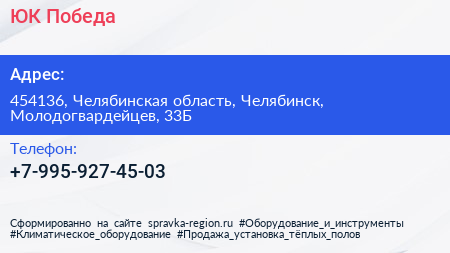 ЮК Победа по адресу 454136, Челябинская область, Челябинск, Молодогвардейцев, 33Б в дальнейшем Организация, размещена в следующих категориях: