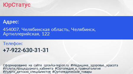 ЮрСтатус по адресу 454007, Челябинская область, Челябинск, Артиллерийская, 122 в дальнейшем Организация, размещена в следующих категориях: