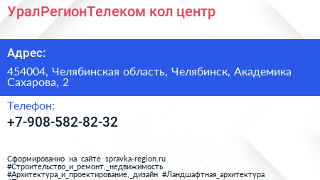 УралРегионТелеком, кол-центр по адресу 454004, Челябинская область, Челябинск, Академика Сахарова, 2 в дальнейшем Организация, размещена в следующих категориях: