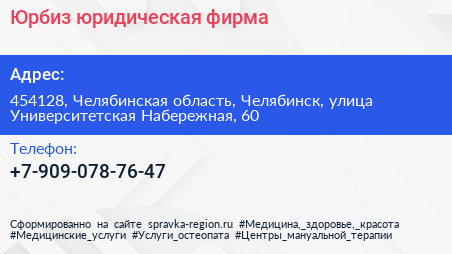 Юрбиз, юридическая фирма по адресу 454128, Челябинская область, Челябинск, улица Университетская Набережная, 60 в дальнейшем Организация, размещена в следующих категориях: