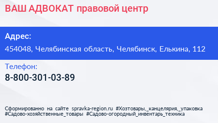 ВАШ АДВОКАТ, правовой центр по адресу 454048, Челябинская область, Челябинск, Елькина, 112 в дальнейшем Организация, размещена в следующих категориях:
