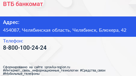 ВТБ, банкомат по адресу 454087, Челябинская область, Челябинск, Блюхера, 42 в дальнейшем Организация, размещена в следующих категориях: