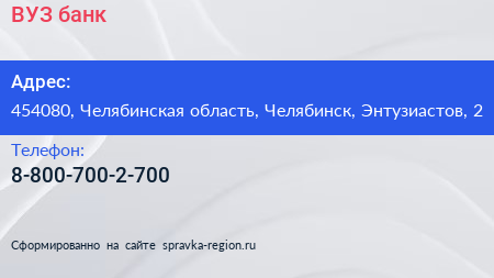 ВУЗ-банк по адресу 454080, Челябинская область, Челябинск, Энтузиастов, 2 в дальнейшем Организация, размещена в следующих категориях:
