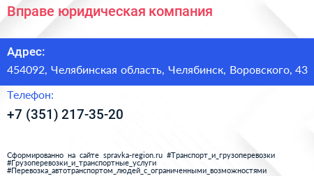 Для связи с организацией воспользуйтесь номером телефона: +7 (351) 217-35-20.