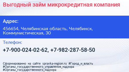 Выгодный займ, микрокредитная компания по адресу 456654, Челябинская область, Челябинск, Коммунистическая, 30 в дальнейшем Организация, размещена в следующих категориях: