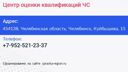 Центр оценки квалификаций ЧС по адресу 454138, Челябинская область, Челябинск, Куйбышева, 15 в дальнейшем Организация, размещена в следующих категориях: